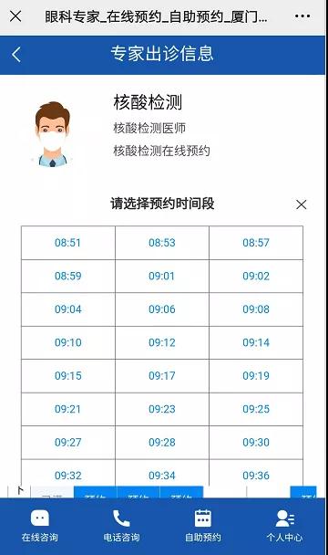 預(yù)約步驟:預(yù)約到診-核酸檢測(cè)預(yù)約-醫(yī)療機(jī)構(gòu)(廈門大學(xué)附屬?gòu)B門眼科中心)-選擇思北/五緣院區(qū)-選擇時(shí)間預(yù)約